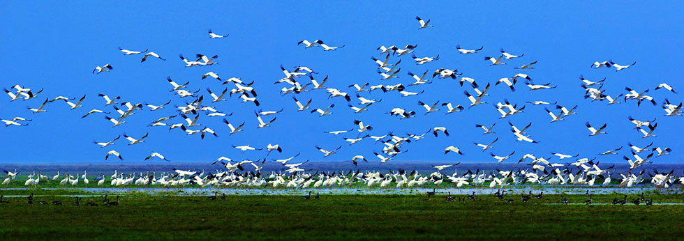 2400多條河流匯聚而成的鄱陽(yáng)湖,是中國(guó)最大的淡水湖,全球重要的濕地,全世界98%的白鶴棲息在它的飛鳥(niǎo)天堂。