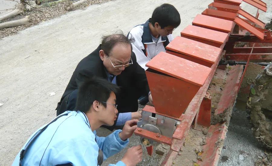 羅錫文院士(中)指導(dǎo)研究生檢查水稻直播機(jī)